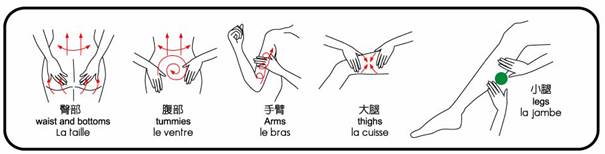 腰部、腹部、大腿、小腿、手臂。