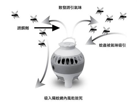 生物性誘餌劑無毒無害,取天然植物萃取模擬人的體味,氣味經自然揮發,引誘雌蚊接近機器周圍,一旦接近入風口,即被風扇吸入後風乾致死,達到捕捉效果。不使用任何殺蟲劑及高壓電擊,無電擊捕蚊器的"啪啪"雜訊,沒有高壓電能防止意外,全程環保無汙染。"環保型補誘劑"有效引誘距離最遠可達33平方公尺。