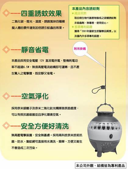 1. 專利技術萃煉出純天然無毒誘蚊劑,模擬人體及動物體味,有效引誘蚊子靠近本機器。