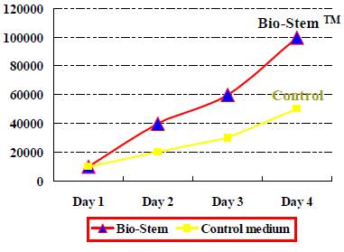 相較於控制組,經過Bio-StemTM處理的人類幹細胞,其生長速率明顯超過控制組約2倍。