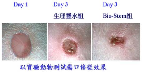 經過Bio-StemTM處理後的第3天,動物的皮膚修復效果明顯優於生理食鹽水的組別。