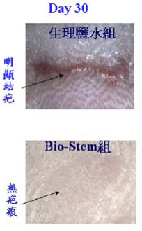 治療第30天時,生理食鹽水治療的動物皮膚仍然有明顯的疤痕存在,而經過Bio-StemTM處理的動
