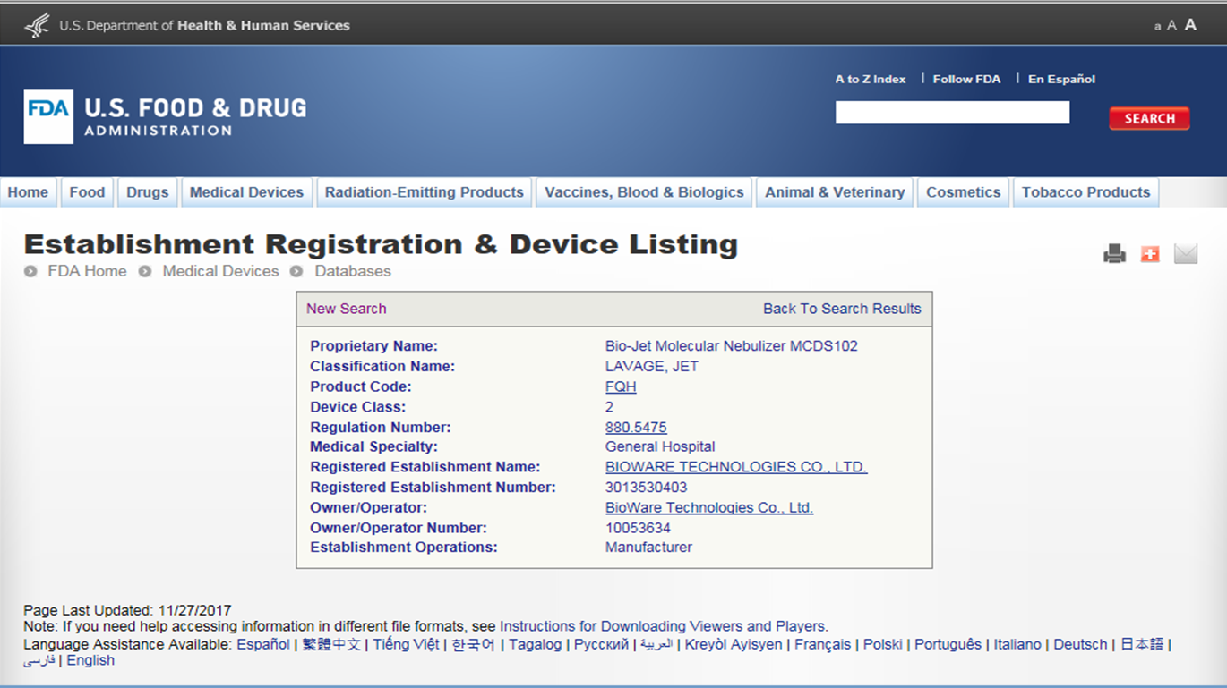 2017年11月醫美器材 BIO-JET 分子霧化儀通過「US FDA」。