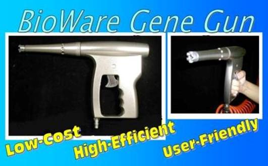BioWare 基因槍為世界首次以氣體動力學為原理所設計之基因投遞系統,可將各種生物性材質送入所有組織及動植物上,並使之有效表現。